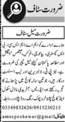Vacant posts including female teacher, librarian, teacher, biology teacher, lab assistant, physics teacher, english teacher, chemistry teacher, pakistan studies teacher, pt instructor and mathematics teacher are announced in Afridi Model School & College Ring Road Peshawar, peshawar Khyber Pakhtunkhwa KPK Pakistan as per 28 July 2025 advertisement in daily Mashriq Newspaper. Persons with Bachelor, Master, Intermediate, MA, Others and M.sc etc. education can apply.