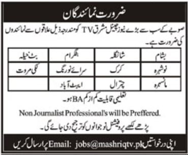 Mashriq TV is looking for candidates for following posts as per job advertisement published in daily Mashriq Newspaper of March 23, 2022 for location Abbottabad, lakki marwat, shangla, abbottabad, batkhela, karak, nowshera, mansehra, chitral and battagram Khyber Pakhtunkhwa KPK Pakistan:
