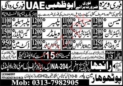 Potohar Manpower Abu Dhabi, abu dhabi UAE invites applications from eligible candidates for the post of mason, plumber helper, plumber, mason helper, gas welder helper, welder, ac chiller technician, duct man, electrician helper, electrician, chiller technician helper and gas welder as per advertisement of August 11, 2024 published in daily Express Newspaper. Matric and Middle etc. educational qualification will be preferred.