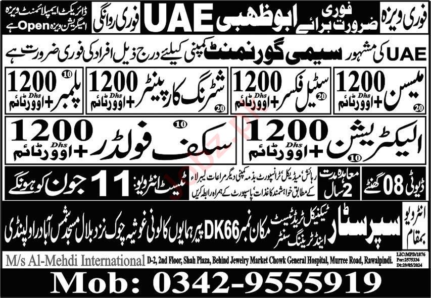 Super Star Technical Trade Test & Training Center is looking for candidates for following posts as per job advertisement published in daily Express Newspaper of June 9, 2024 for location Abu Dhabi, abu dhabi UAE: