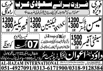 Vacant posts including mason, fabricator, safety officer and hvac technician are announced in Al Hazam International Riyadh, riyadh Saudi Arabia as per 7 August 2024 advertisement in daily Express Newspaper. Persons with Matric, Bachelor, Intermediate and Middle etc. education can apply.