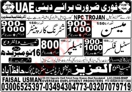 Faisal Usman Overseas Employment Promoters UAE, dubai UAE invites applications from eligible candidates for the post of helper, steel fixer, mason and shuttering carpenter as per advertisement of November 13, 2022 published in daily Express Newspaper. Middle and Primary etc. educational qualification will be preferred.
