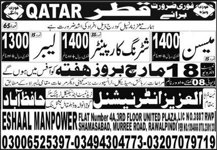 Eshaal Manpower Overseas Employment Promoters invites applications for job positions advertised in daily Express dated 17 March 2023 for following vacancies in Qatar, qatar Qatar.