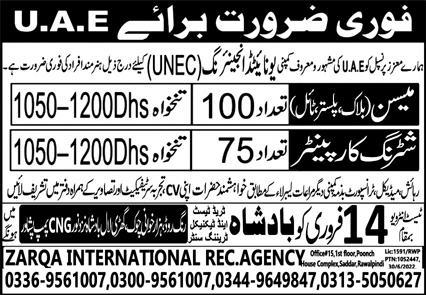Zarqa International Recruiting Agency jobs advertisement dated about 6 February 2023 in daily Express Newspaper invites application for the vacant post of plaster mason, tile mason, block mason and shuttering carpenter in Abu Dhabi, abu dhabi UAE. Educational qualifications required Middle etc.