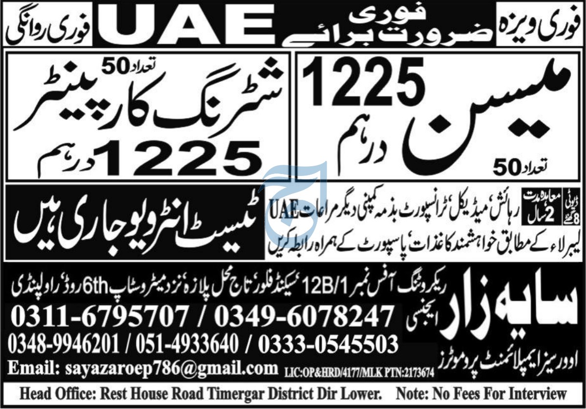 Vacant posts including shuttering carpenter and mason are announced in Sayazar Recruiting Agency Abu Dhabi, abu dhabi UAE as per 2 January 2024 advertisement in daily Express Newspaper. Persons with Middle etc. education can apply.