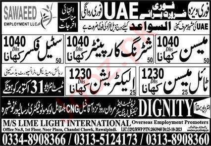 LIME LIGHT INTERNATIONAL UAE, dubai UAE invites applications from eligible candidates for the post of steel dixer, shuttering carpenter, mason, electrician and tile mason as per advertisement of October 29, 2023 published in daily Express Newspaper. Primary, Matric and Middle etc. educational qualification will be preferred.