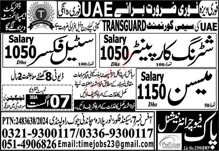 Vacant posts including shuttering carpenter, mason and steel fixer are announced in Pak Future International Abu Dhabi, dubai UAE as per 4 August 2024 advertisement in daily Express Newspaper. Preferred Education is Middle and Matric etc.