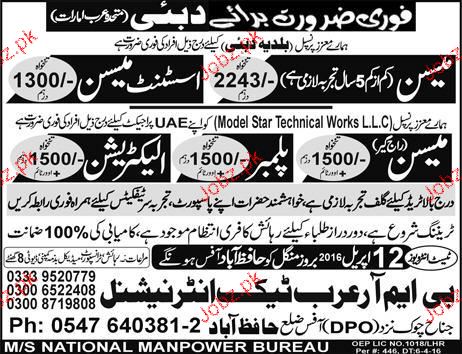 Mason, Assistant Mason, Plumbers and Electricians are required in Dubia.