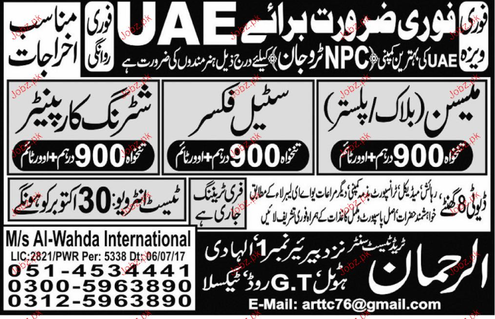 Latest Al Rehman Trade Test Construction Posts UAE 2025