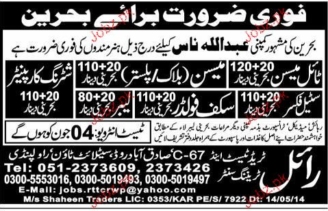 Mason Block, Shuttering Carpenters, Labors Job Opportunity