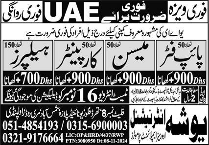 Yosha International Overseas Employment Promoters invites applications for job positions advertised in daily Express dated 15 November 2024 for following vacancies in Sharjah, abu dhabi UAE.