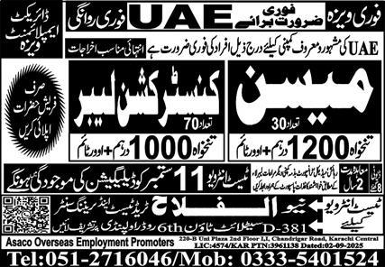 New Al Falah Trade Test & Training Center Abu Dhabi, sharjah UAE invites applications from eligible candidates for the post of construction labor and mason as per advertisement of December 10, 2025 published in daily Express Newspaper. Preferred Education is Intermediate and Matric etc.