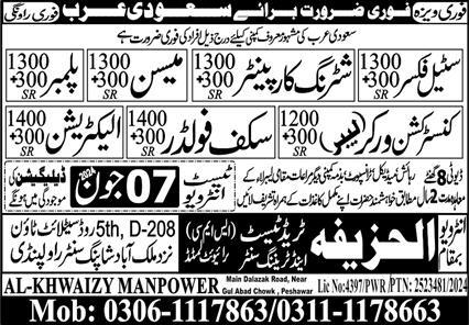 Al Huzaifa Trade Test & Training Centre invites applications for job positions advertised in daily Express dated 6 June 2024 for following vacancies in Riyadh, dammam Saudi Arabia.
