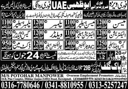 Potohar Manpower invites applications for job positions advertised in daily Express dated 21 June 2024 for following vacancies in Abu Dhabi, abu dhabi UAE.