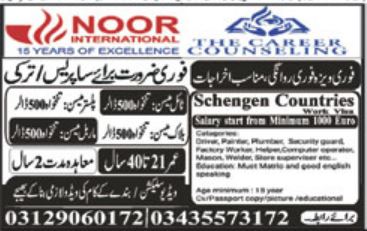 Noor International is looking for candidates for following posts as per job advertisement published in daily Express Newspaper of June 18, 2022 for location Turkey / Cyprus :