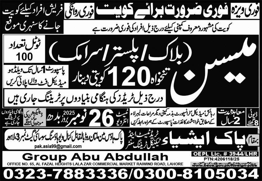 Group Abu Abdullah Overseas Employment Promoter invites applications for job positions advertised in daily Express dated 23 November 2025 for following vacancies in Kuwait, kuwait Kuwait.