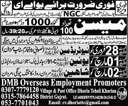 DMB Overseas Employment Promoters Abu Dhabi, sharjah UAE invites applications from eligible candidates for the post of mason as per advertisement of February 25, 2023 published in daily Express Newspaper. Middle and Matric etc. educational qualification will be preferred.