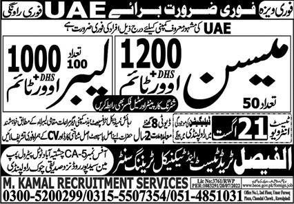 Vacant posts including labor and mason are announced in Al Faisal Trade Test & Technical Training Center Sharjah, sharjah UAE as per 18 August 2022 advertisement in daily Express Newspaper. Educational qualifications required Matric and Middle etc.