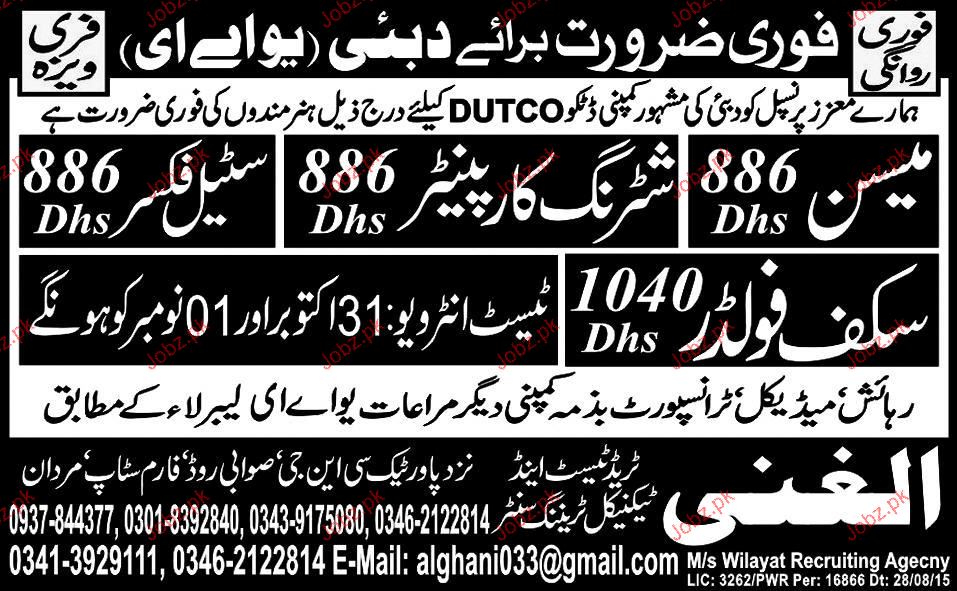 Mason, Scaffolders, Shuttering Carpenters and Steel Fixers are required in Dubai.