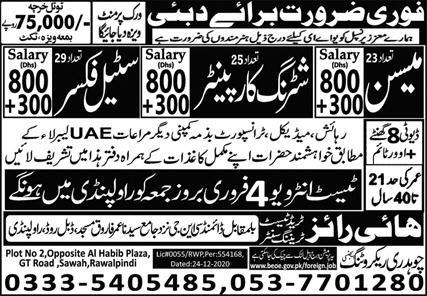 Vacant posts including mason, shuttering carpenter and steel fixer are announced in Chaudhary Recruiting Agency Dubai Dubai as per 4 February 2022 advertisement in daily Express Newspaper. Persons with Matric and Middle etc. education can apply.