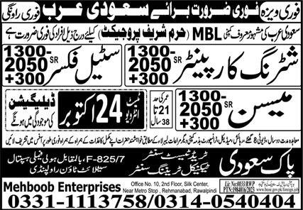 Pak Saudi Trade Test & Technical Training Center Madina, makkah Saudi Arabia invites applications from eligible candidates for the post of steel fixer, shuttering carpenter and mason as per advertisement of October 21, 2023 published in daily Express Newspaper. Preferred Education is Intermediate and Matric etc.