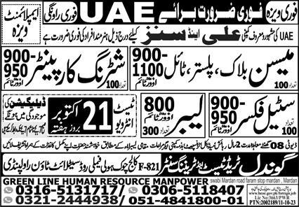 Vacant posts including plaster mason, block mason, tile mason, steel fixer, shuttering carpenter, mason and labor are announced in Green Line Human Resource Manpower UAE, uae UAE as per 17 October 2023 advertisement in daily Express Newspaper. Primary, Matric, Intermediate and Middle etc. educational qualification will be preferred.