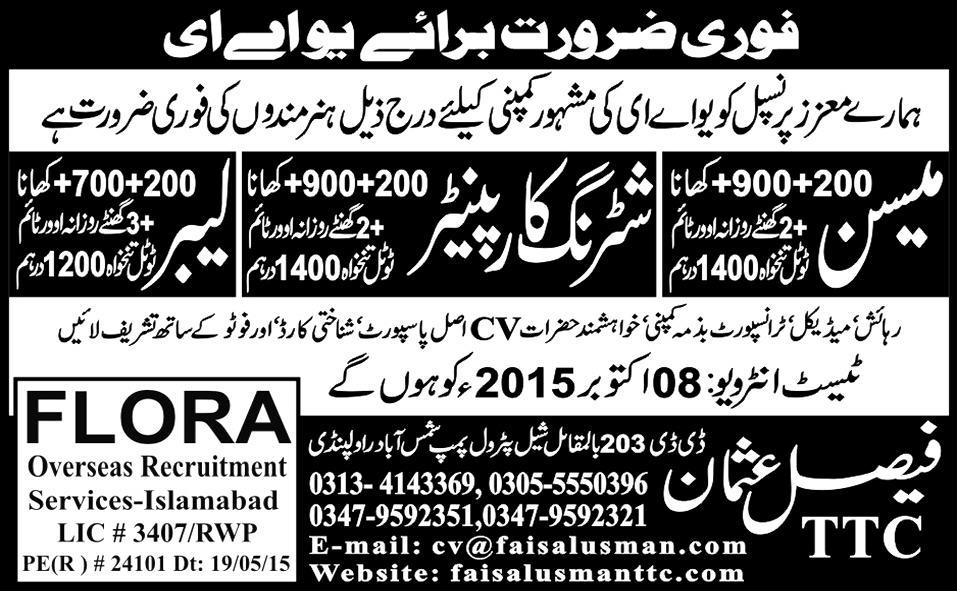 Mason, Shuttering Carpenters and Labors Job Opportunity