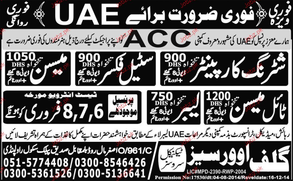 Mason, Shuttering Carpenters, Steel Fixers, Tile Mason and Labors are required in Dubai.