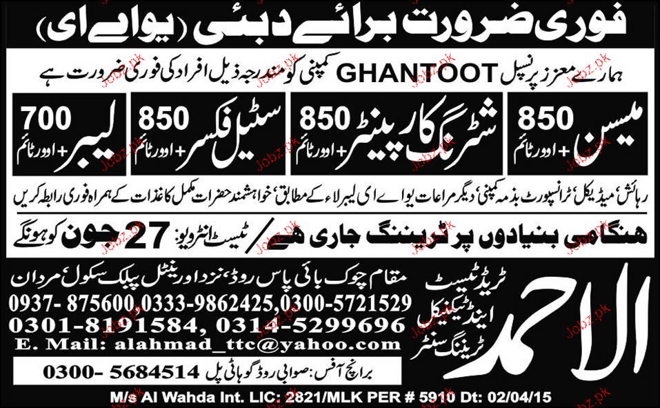 Mason, Shuttering Carpenters, Steel Fixers Job Opportunity