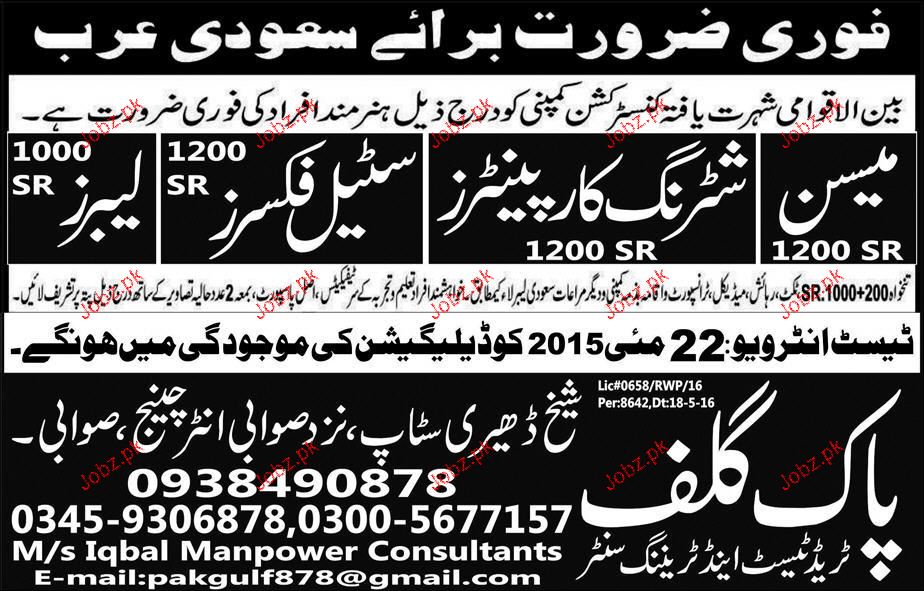 Mason, Shuttering Carpenters, Steel Fixers and Labors are required in Saudi Arabia.