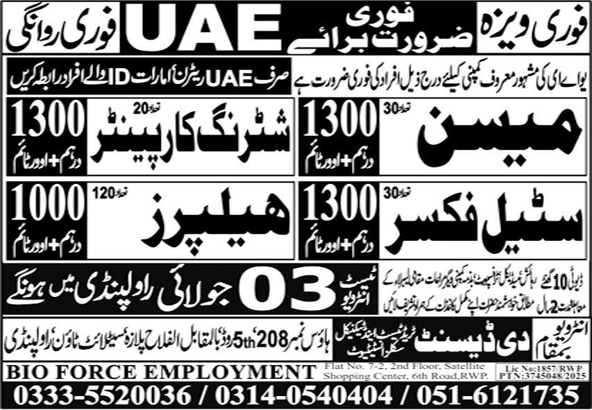 The Descent Trade Test Center invites applications for job positions advertised in daily Express dated 1 July 2025 for following vacancies in Abu Dhabi, sharjah UAE.