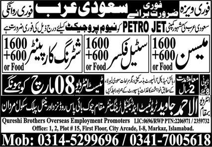 Qureshi Brothers Overseas Employment Promoters is looking for candidates for following posts as per job advertisement published in daily Express Newspaper of March 7, 2024 for location Saudi Arabia, saudi arabia Saudi Arabia: