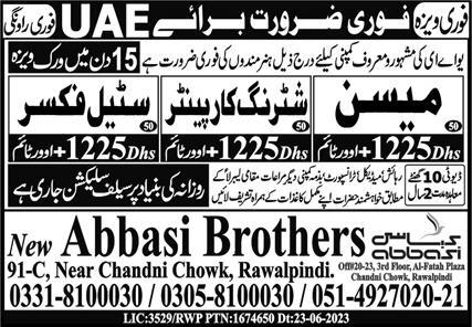 New Abbasi Brothers Oversea Employment Promoters invites applications for job positions advertised in daily Express dated 10 October 2023 for following vacancies in Sharjah, abu dhabi UAE.