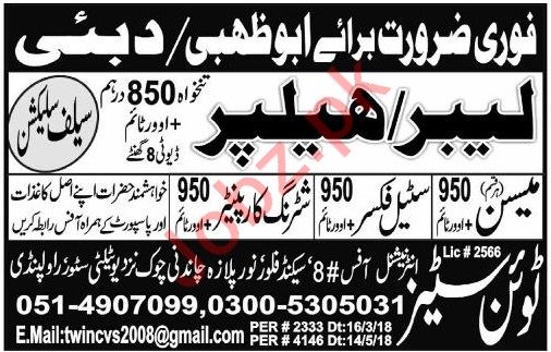 Mason, Steel Fixer, Labor & Shuttering Carpenter Jobs 2018