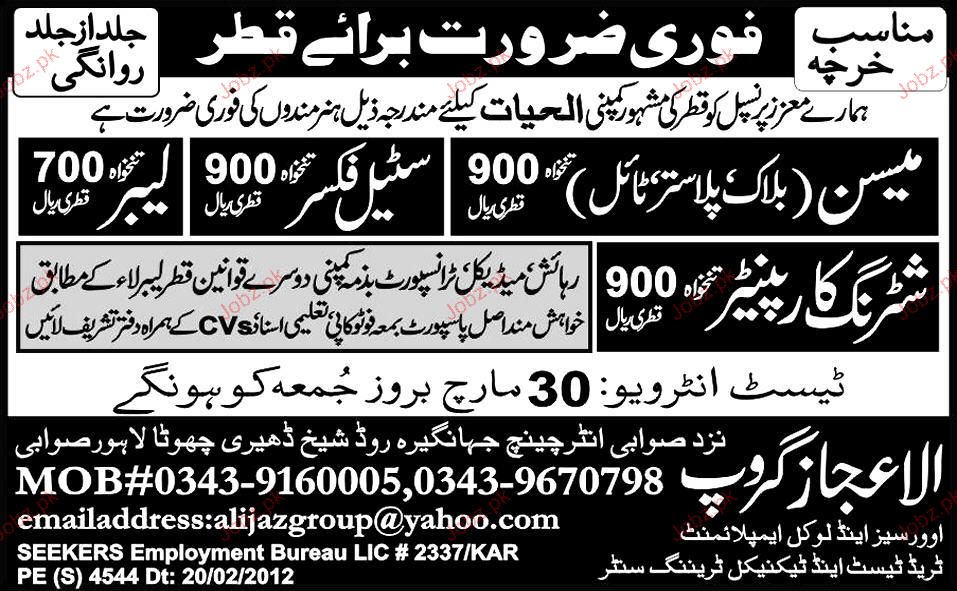 Mason, Steel Fixer, Labors and Shuttering Carpenter Wanted