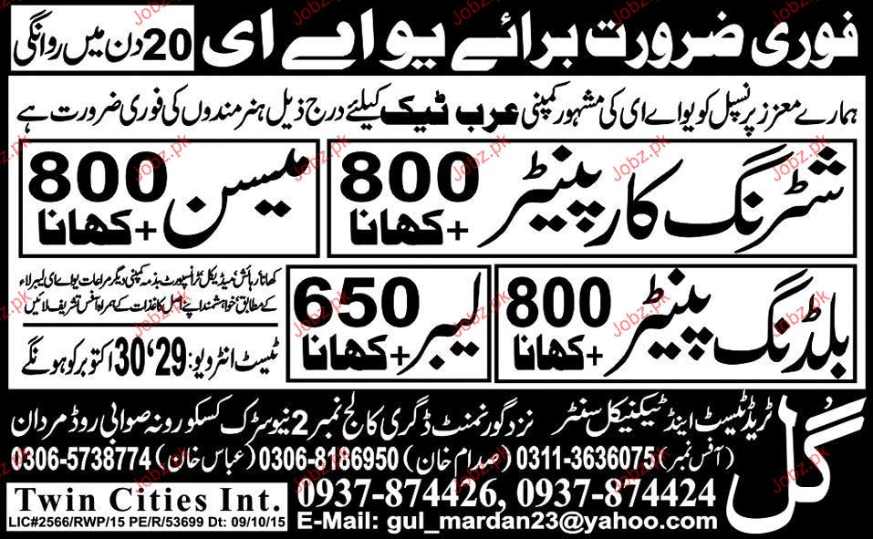 Mason, Steel Fixers, Shuttering Carpenters, Building Painters and Labors are required in UAE.