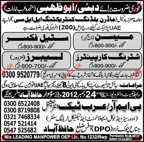 Mason, Steel Fixers, Shuttering Carpenters Job Opportunity