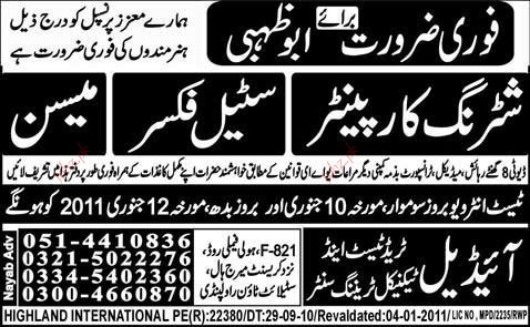 Mason, Suturing Care Painter, Steel Fixer job Opportunity in Abu Dhabi
