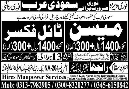 Ranjha Trade Test & Training Center jobs advertisement dated about 11 July 2025 in daily Express Newspaper invites application for the vacant post of mason and tile fixer in Dammam, taif Saudi Arabia. Candidates with Intermediate, Middle and Matric etc. educational background will be preferred.