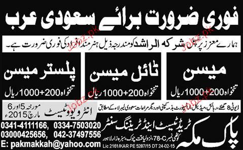 Mason, Tile Mason And Plaster Mason Job Opportunity