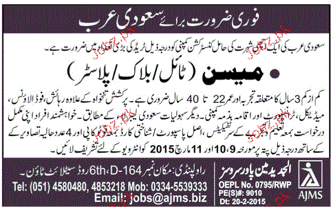 Mason Tile, Mason Block And Mason Plasters Job Opportunity