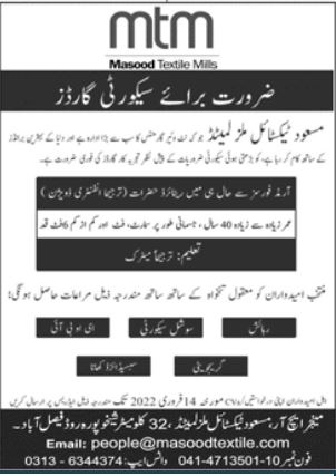 Masood Textile Mills Limited jobs advertisement dated about 30 January 2022 in daily Jang Newspaper invites application for the vacant post of security guard in Faisalabad Punjab Pakistan. Preferred Education is Matric and Middle etc.