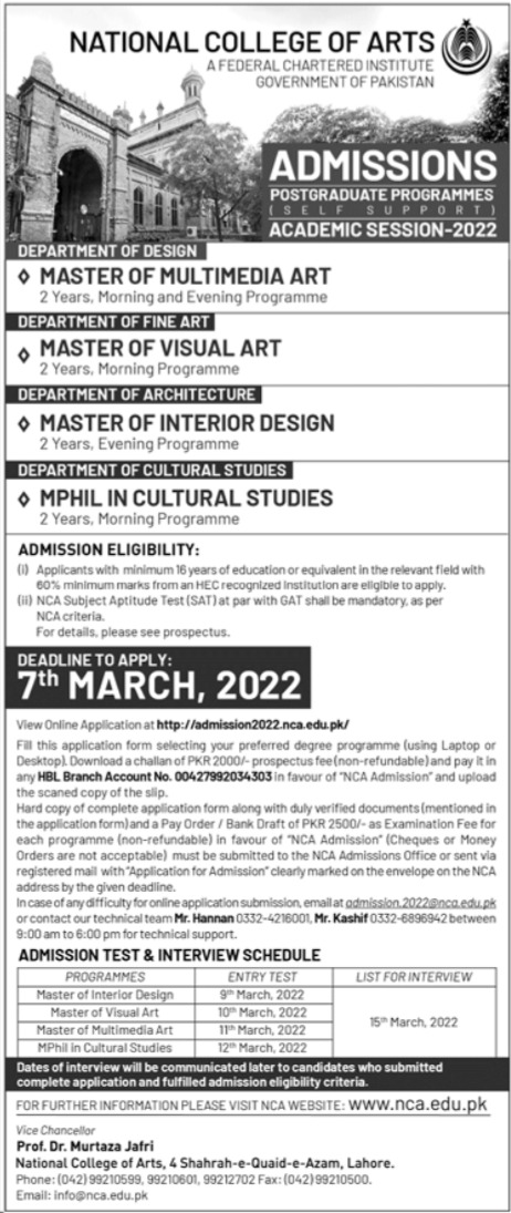 National College of Arts NCA Master of Multimedia Art, Master of Visual Art, Master of Interior Design, MPhil in Cultural Studies admissions 2022 has been started. Eligible students who qualify as per admission criteria in National College of Arts NCA Lahore Punjab Pakistan can apply in Arts College for academic year 2022. Students who want to enroll for academic session 2022 in Mphil and Master qualification and admission criteria for Government institute can apply till last date 7 March 2022. Read newspaper ad for exact details.