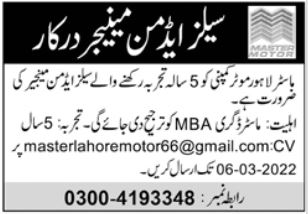 Master Motor Corporation Lahore, Lahore Punjab Pakistan invites applications from eligible candidates for the post of sales admin manager as per advertisement of February 27, 2022 published in daily Jang Newspaper. Preferred Education is MBA etc.