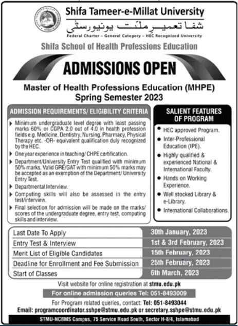 Shifa Tameer e Millat University STMU Master of Health Professions Education MHPE admissions 2022 has been started. Students who want to take admissions in Shifa Tameer e Millat University STMU Islamabad Islamabad Pakistan for academic year 2022 to continue education in Management University can apply. Students for admissions in Master & criteria can apply as per Private institute admission policy 2022 before closing date January 30, 2023 as per advertisement. Read newspaper ad for exact details.