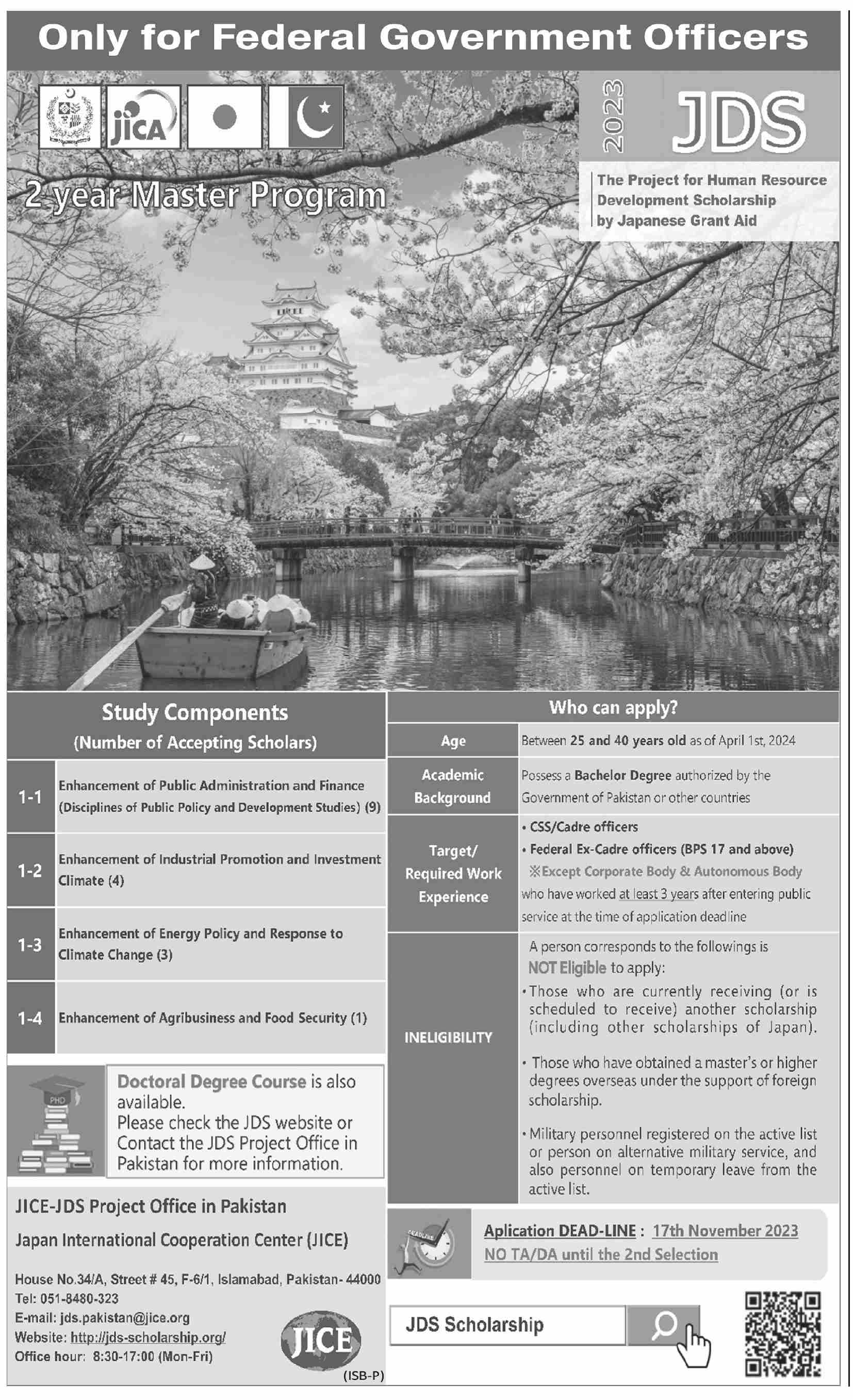 Admissions in Japan International Cooperation Agency JICA 2023 for Master Programs has been announced. Japan International Cooperation Agency JICA Islamabad Islamabad Pakistan welcomes students to apply for admissions in academic year 2023 in Science University. Eligible students for fulfilling criteria for admissions in Master can enroll as per Government admission policy 2023 till closing date 17 November 2023. Read newspaper ad for exact details.