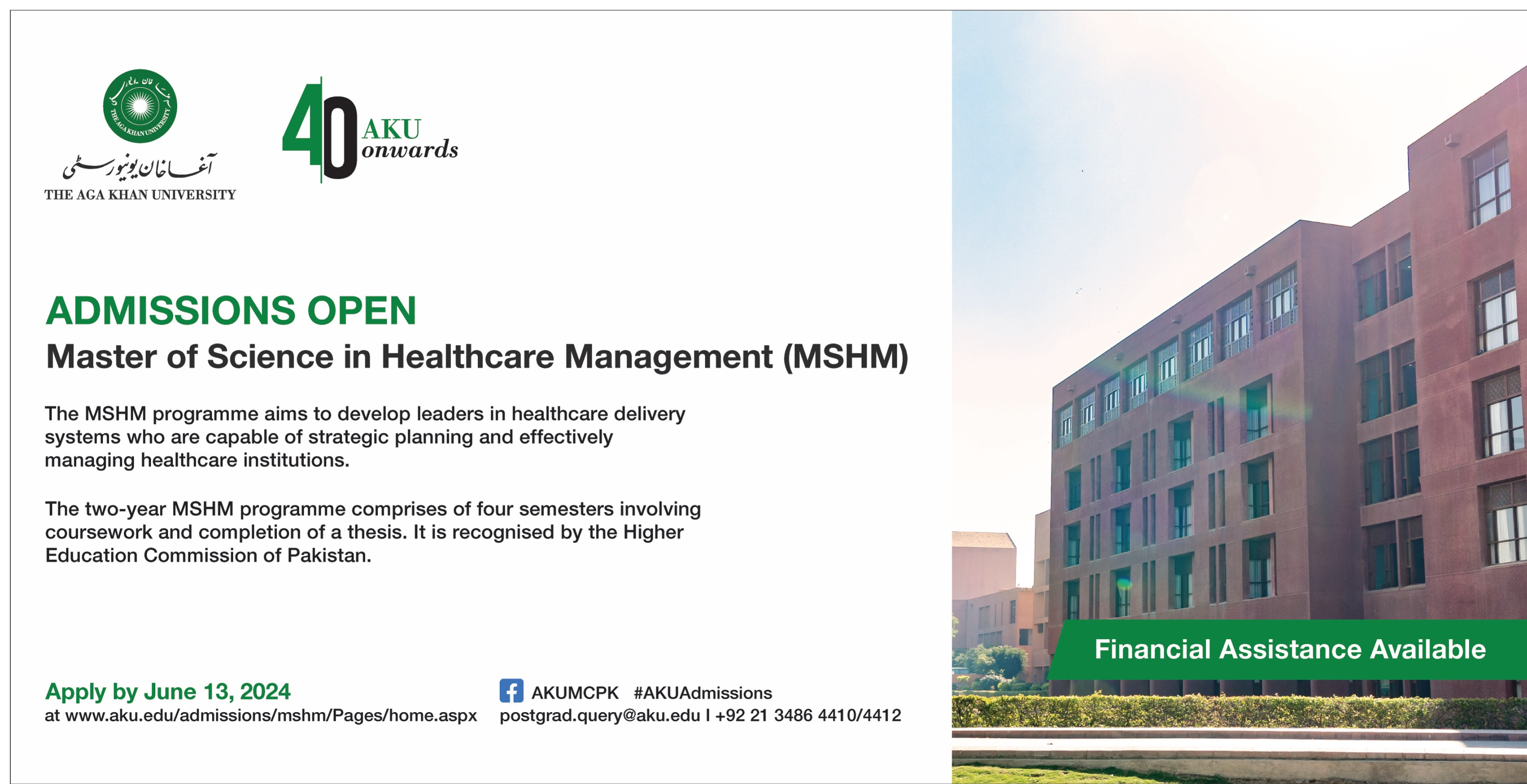 The Aga Khan University Master of Science in Healthcare Management admissions 2024 has been started. Students who want to take admissions in The Aga Khan University Karachi Sindh Pakistan for academic year 2024 to continue education in Science University can apply. Students for admissions in Master & criteria can apply as per Private institute admission policy 2024 before closing date May 21, 2024 as per advertisement. Read newspaper ad for exact details.