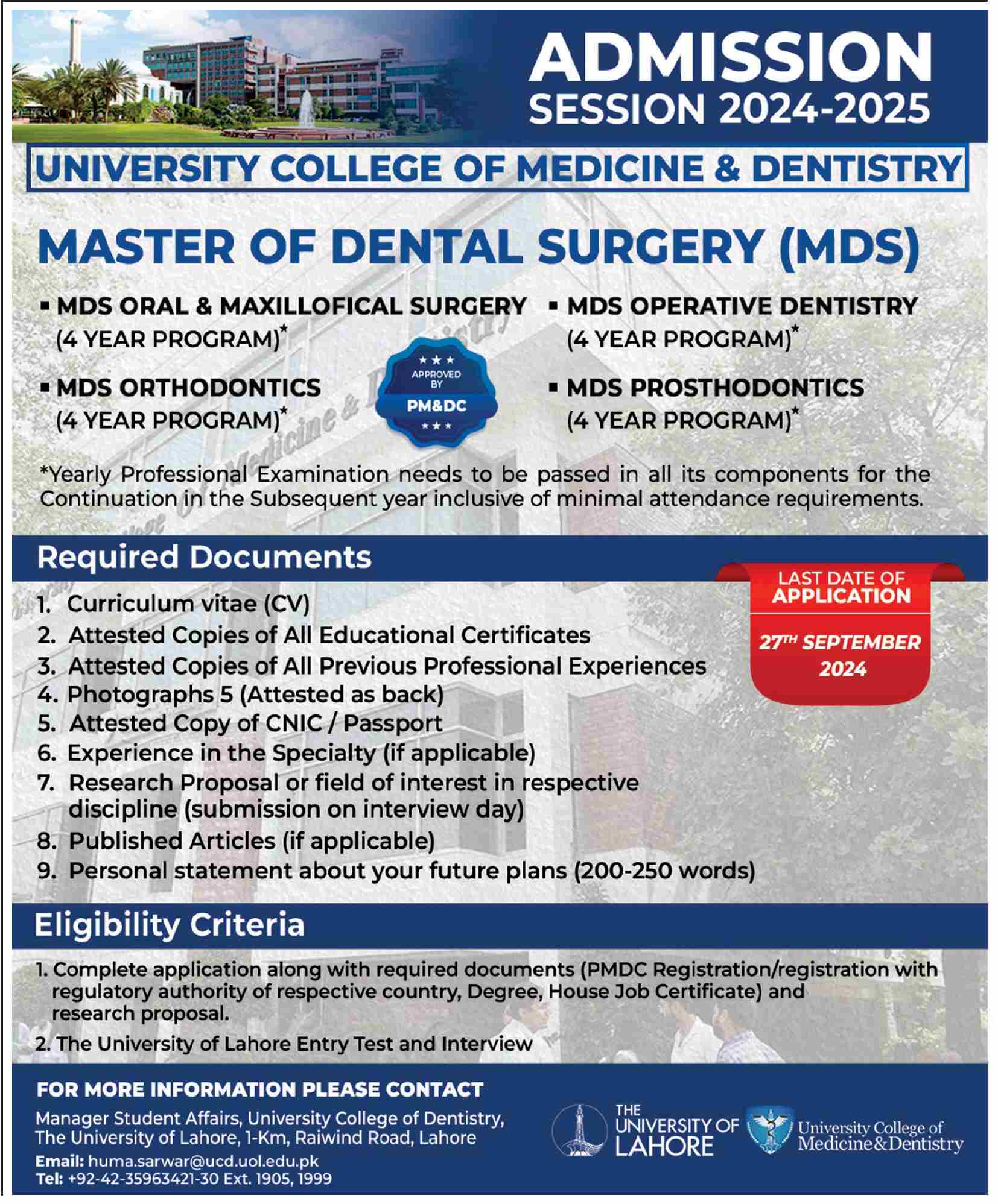 Admissions in The University College of Medicine & Dentistry 2024 for Master of Dental Surgery MDS has been announced. Students can enroll for admissions in The University College of Medicine & Dentistry Lahore Punjab Pakistan for academic year 2024 to continue campus based or online education in Medical University. Eligible students for fulfilling criteria for admissions in Master can enroll as per Private admission policy 2024 till closing date 27 September 2024. Read newspaper ad for exact details.