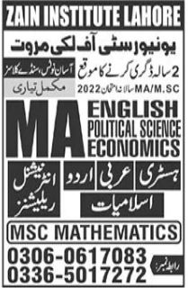 Zain Institute MA English, MA Political Science, MA Economics, MA History, MA Arabic, MA Urdu, MA Islamiat, MA International Relations, MSc Mathematics admissions 2022 has been started. Students can enroll for admissions in Zain Institute Lakki Marwat Khyber Pakhtunkhwa KPK Pakistan for academic year 2022 to continue campus based or online education in Science University. Eligible students for fulfilling criteria for admissions in MA and M.sc can enroll as per Private admission policy 2022 till closing date 12 July 2022. Read newspaper ad for exact details.
