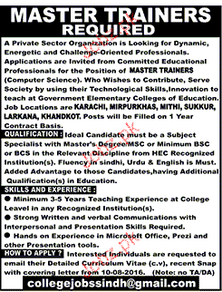 Apply as per details in job advertisement. Login to view further details of how to apply via https://www.jobz.pk online.